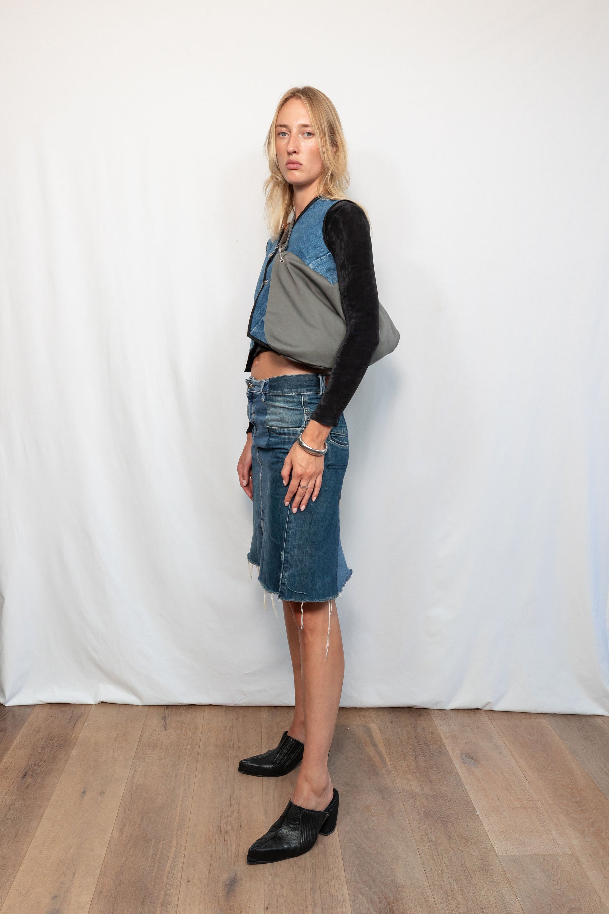 Featuring: removable strap, zip closure, inside pocket, cotton lining and black denim carabiner keychain.