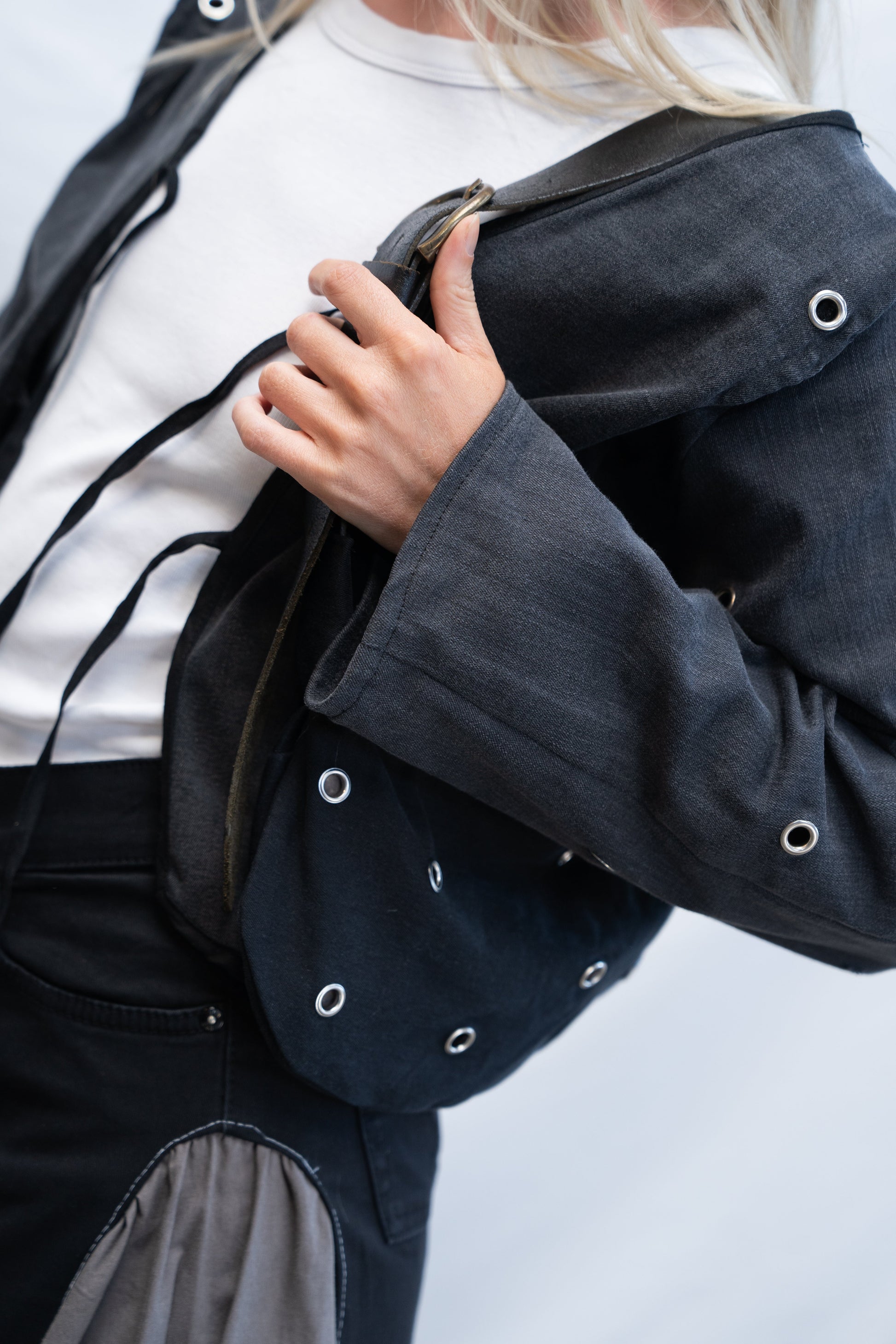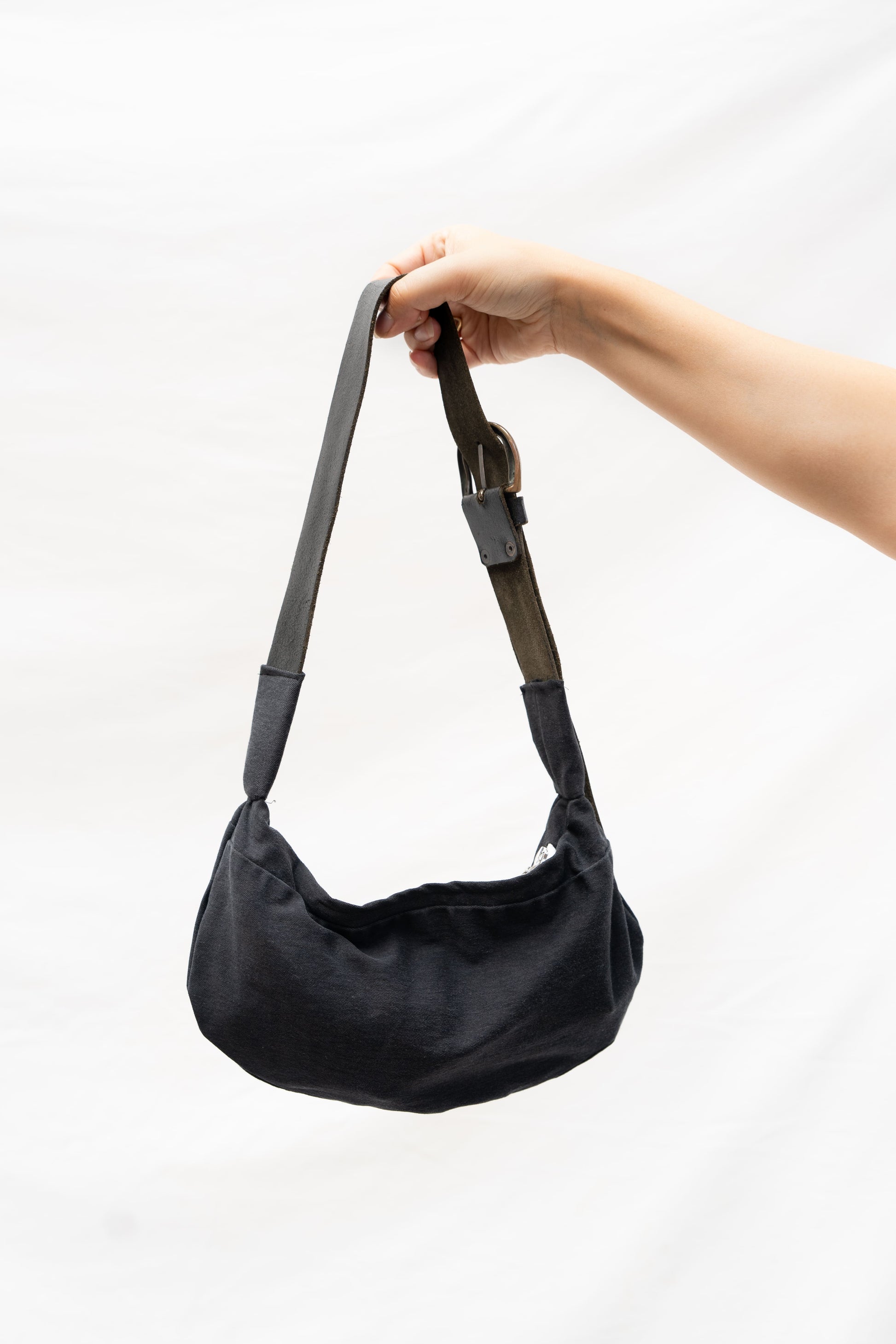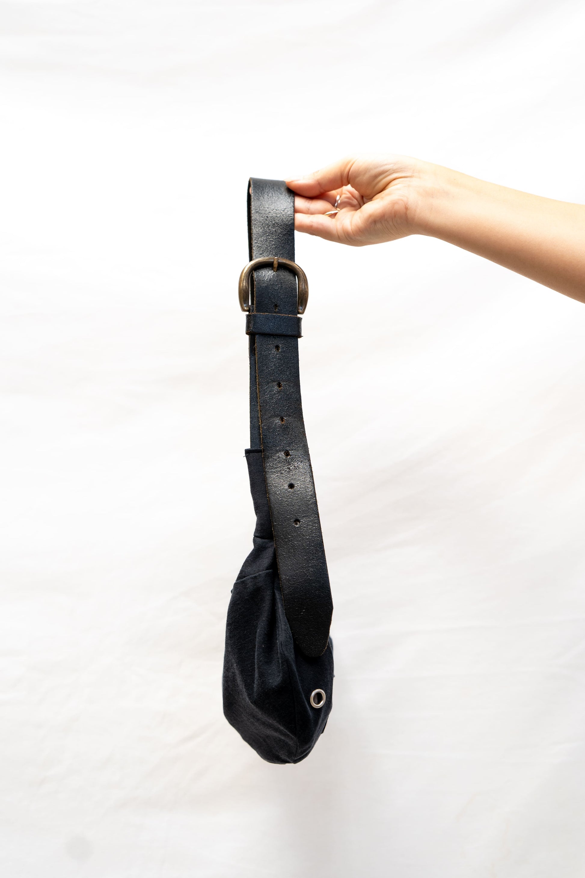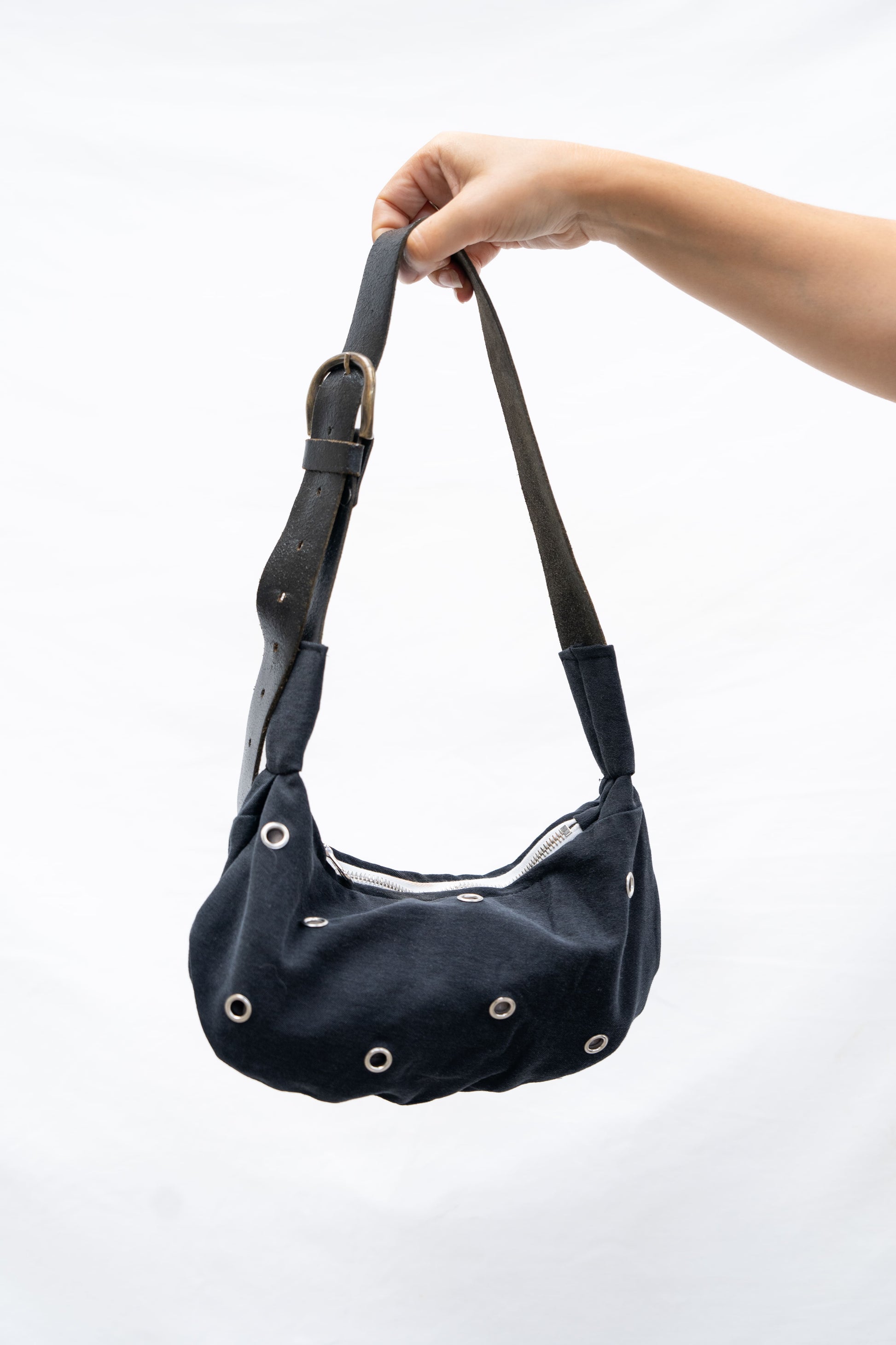 Our bestselling handbag now in black denim with eyelet details. With a white contrast zip and our signature upcycled belt handle.