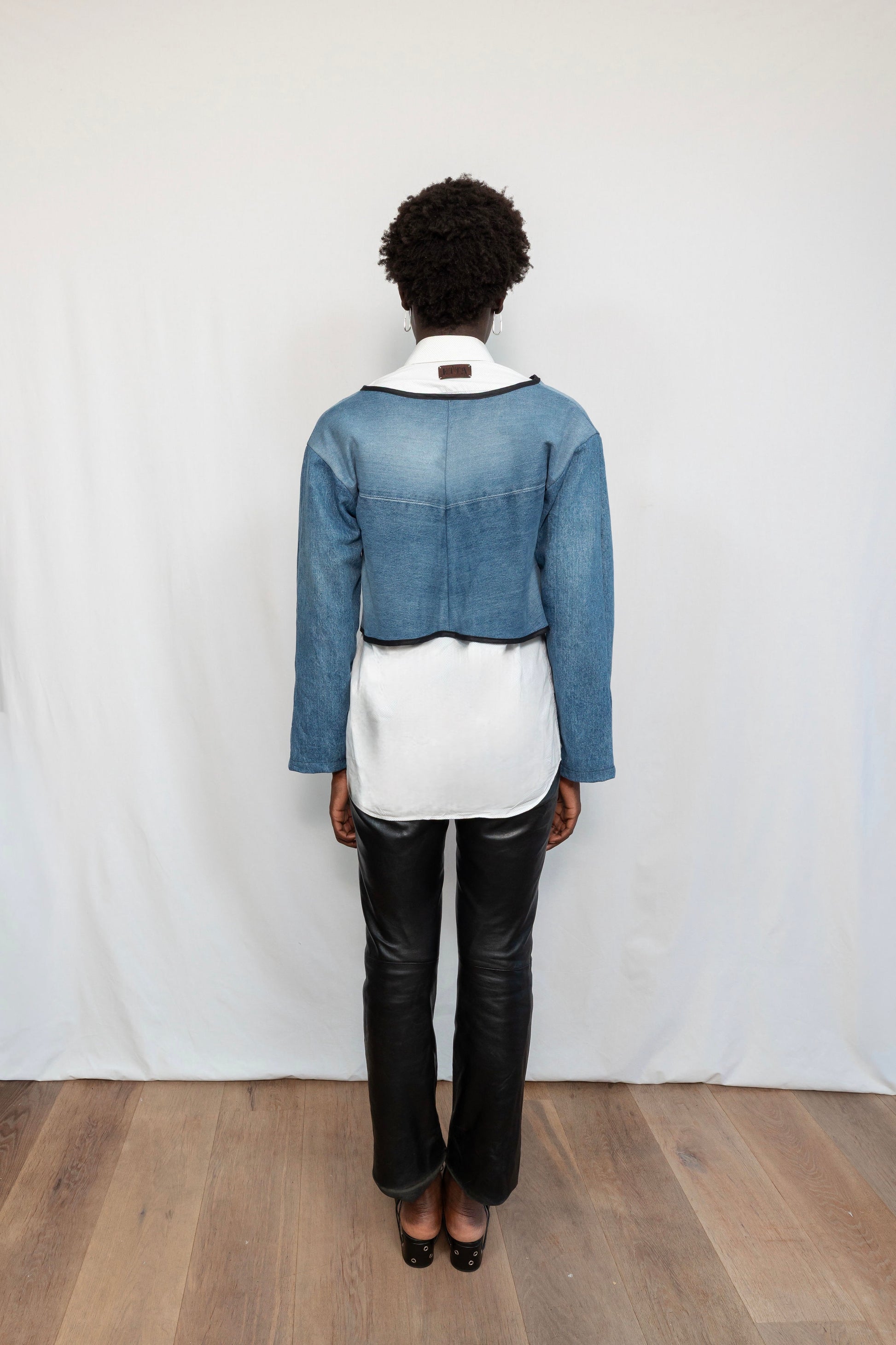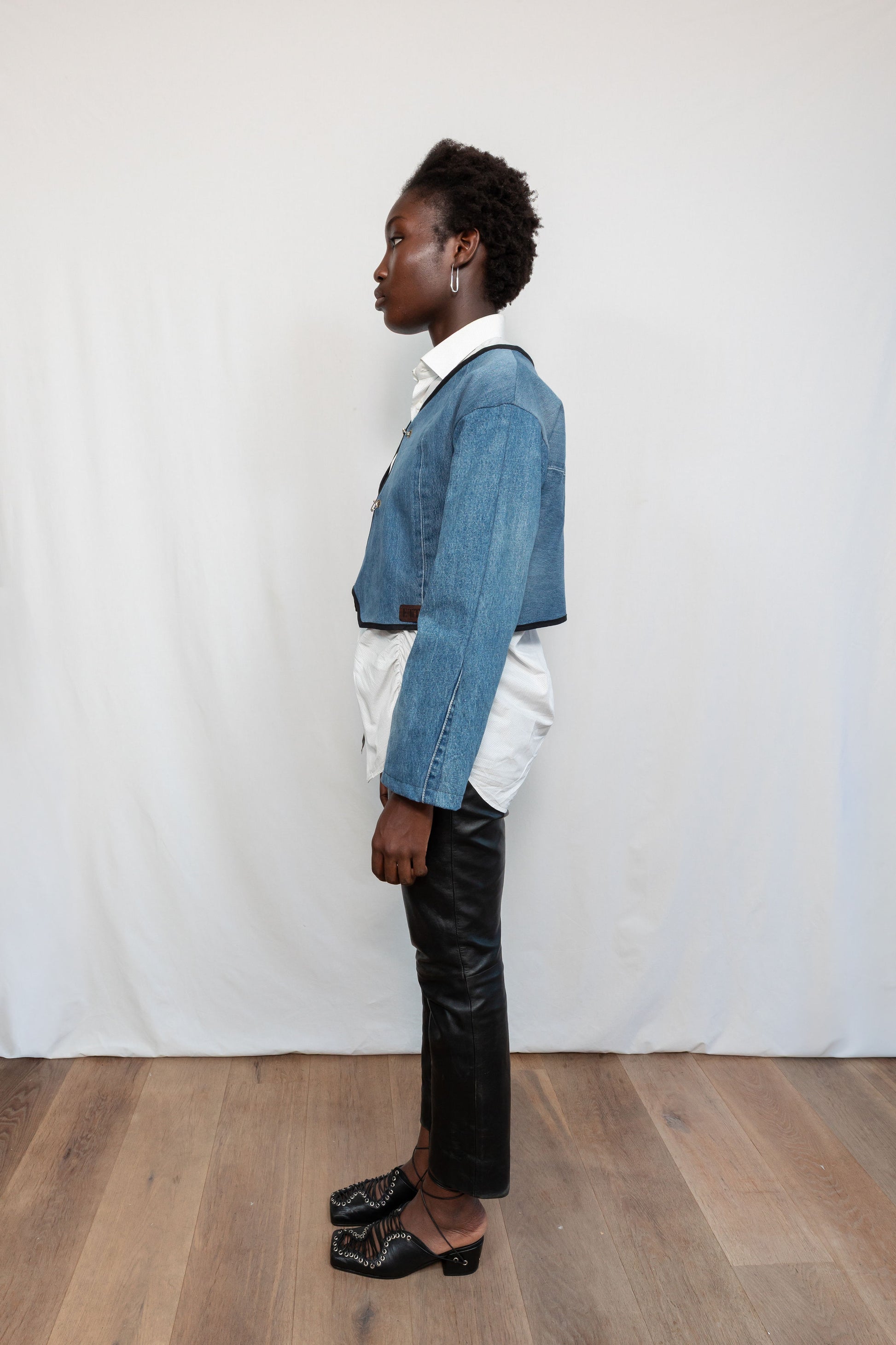 This gorgeous upcycled blue denim cropped jacket, with a boxy structured fit. Kilt pins fastenings, flared sleeves and rugged texture add a bold, modern touch to any outfit. Made to order.