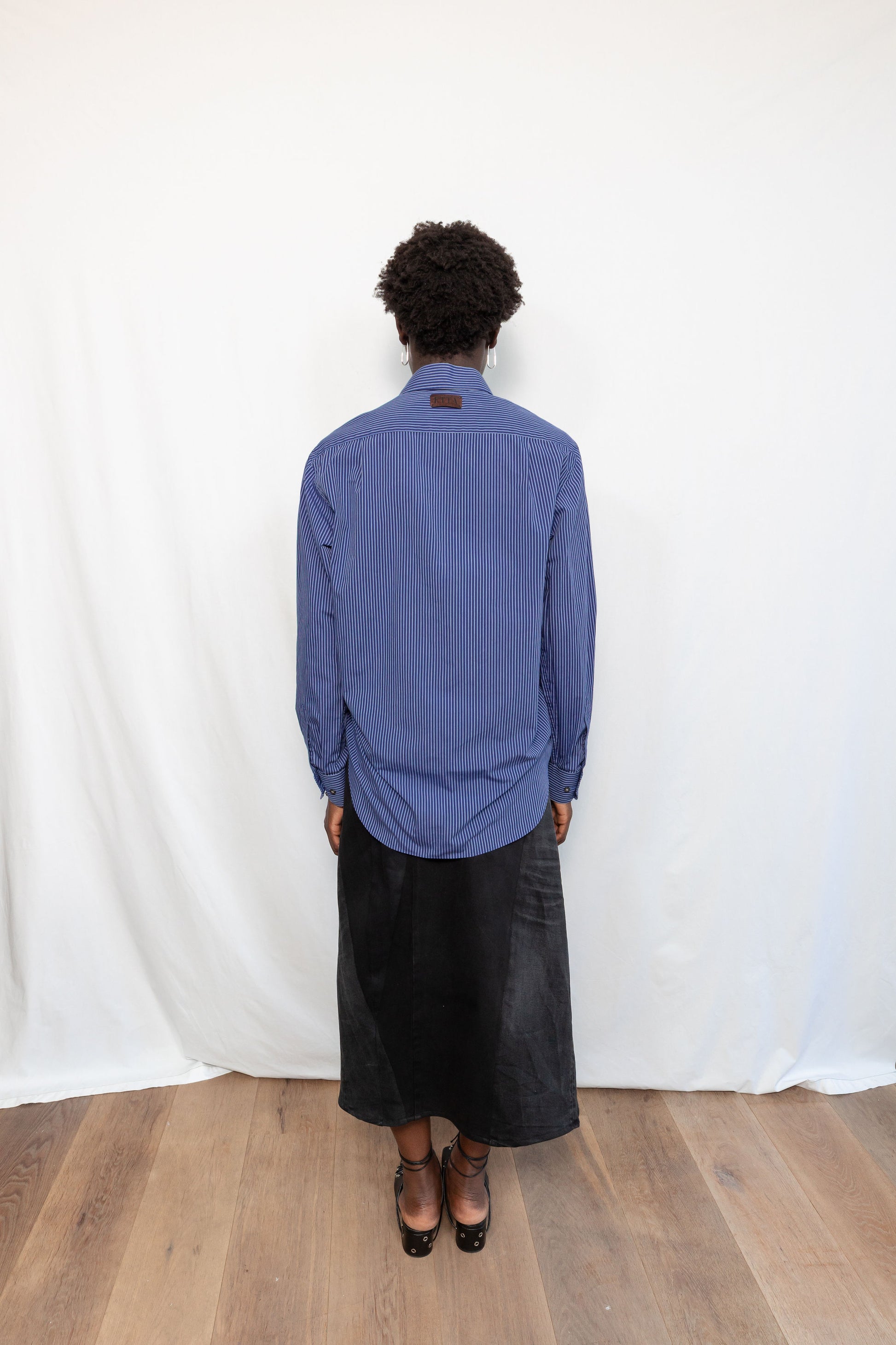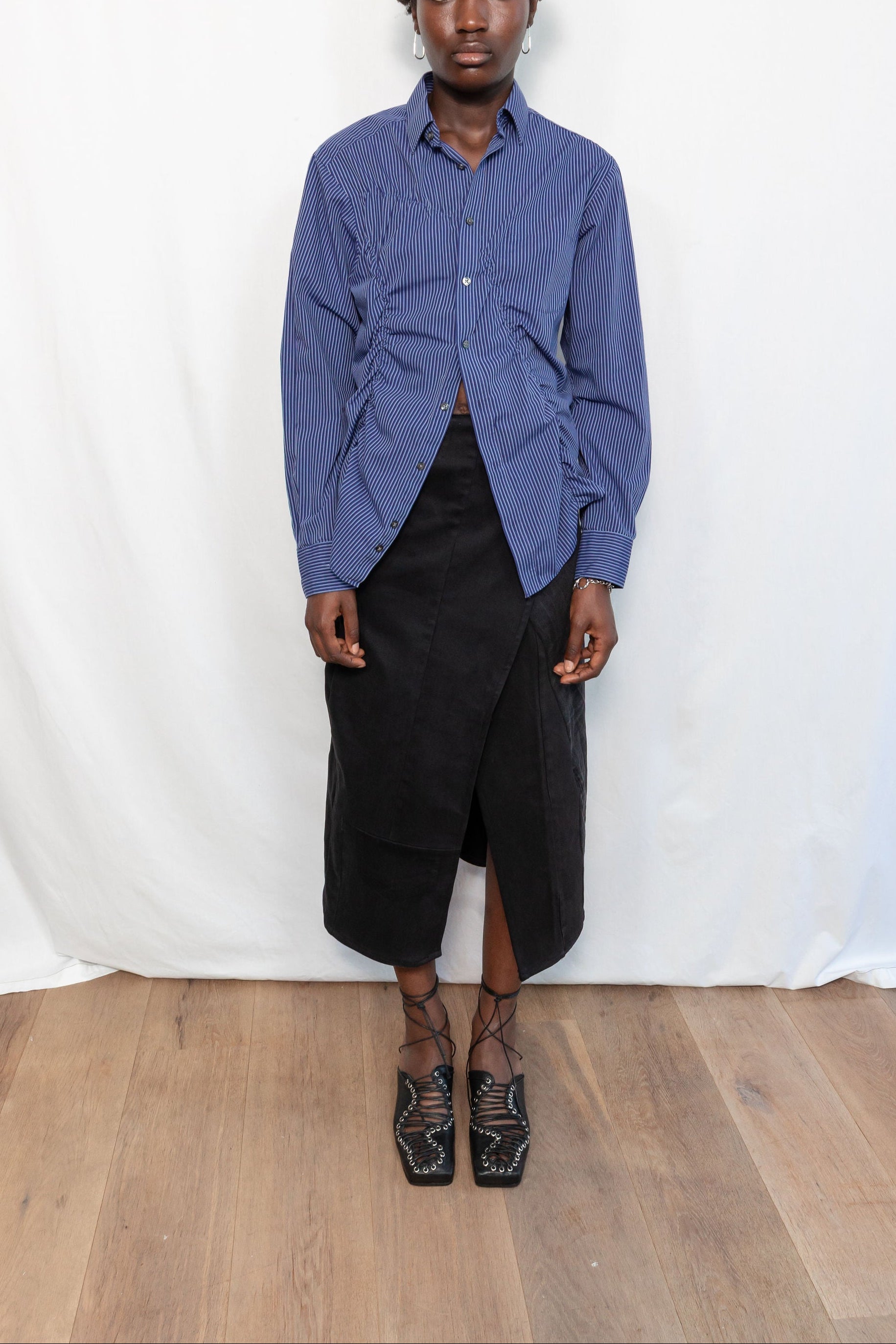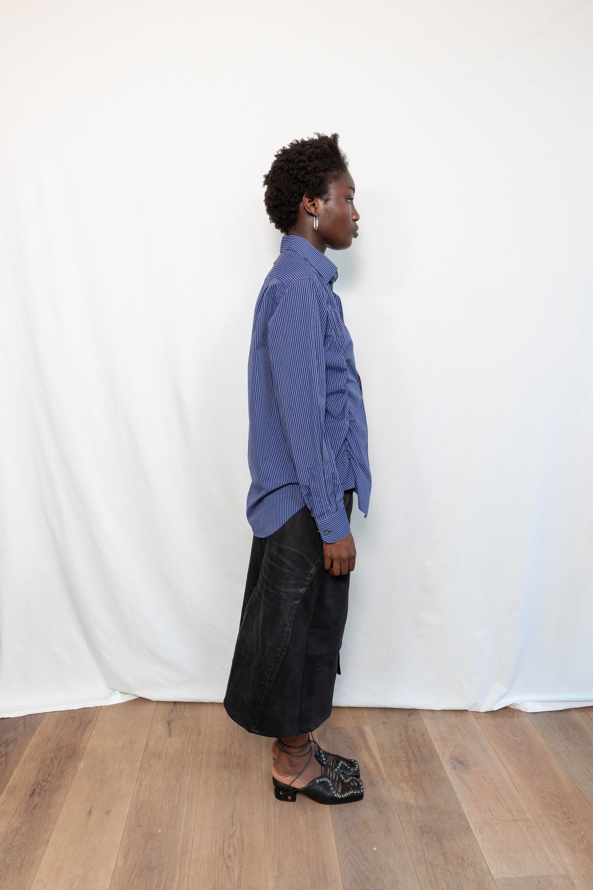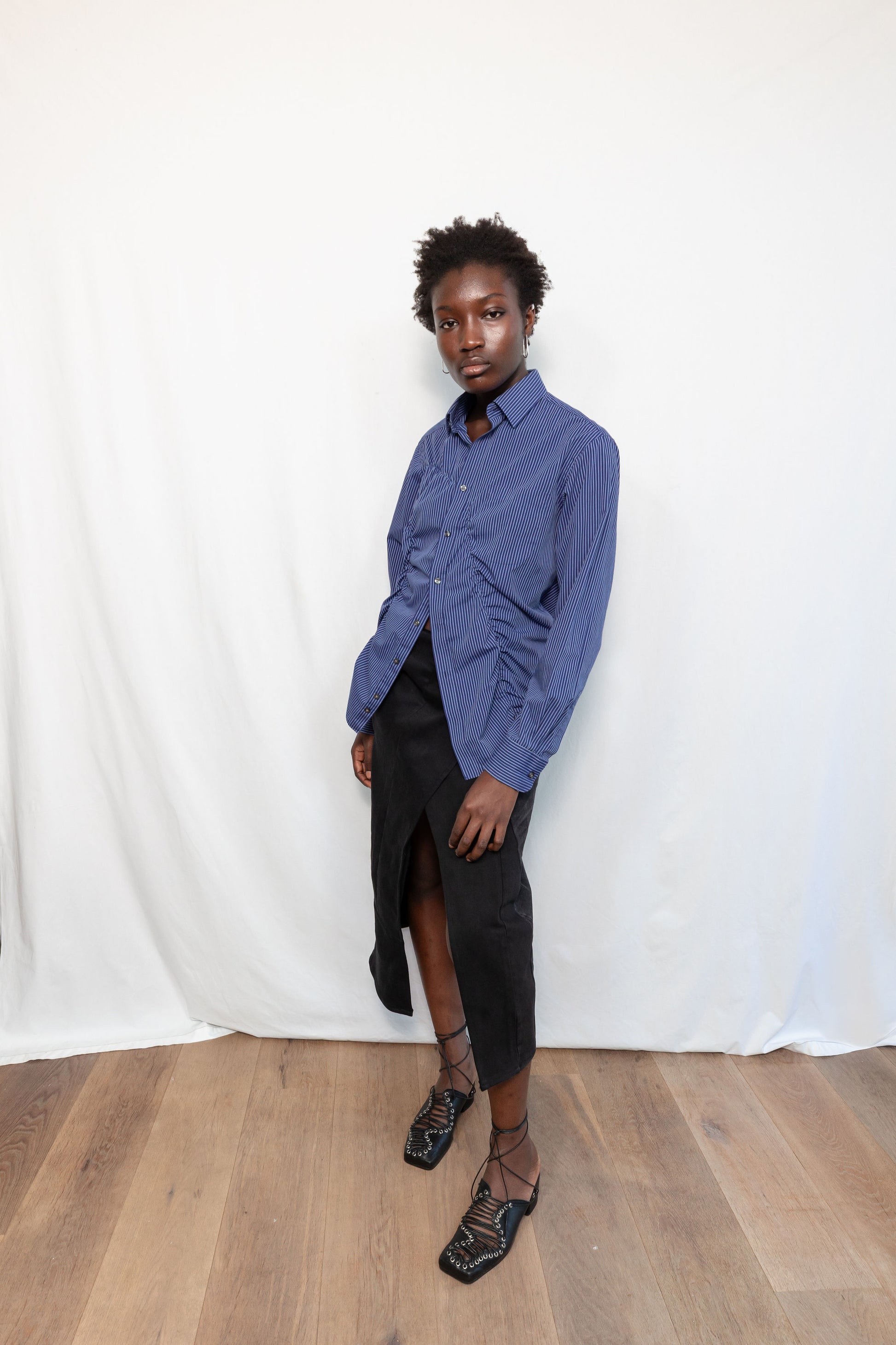 Our bestselling wave shirt in a blue stripe. With two lines of asymmetric shirring that cinch in at the perfect points to flatter. Pair with a denim skirt for a casual look or spice it up with a pair of leather trousers (vintage of course!). Can be worn oversized or a bit more fitted.