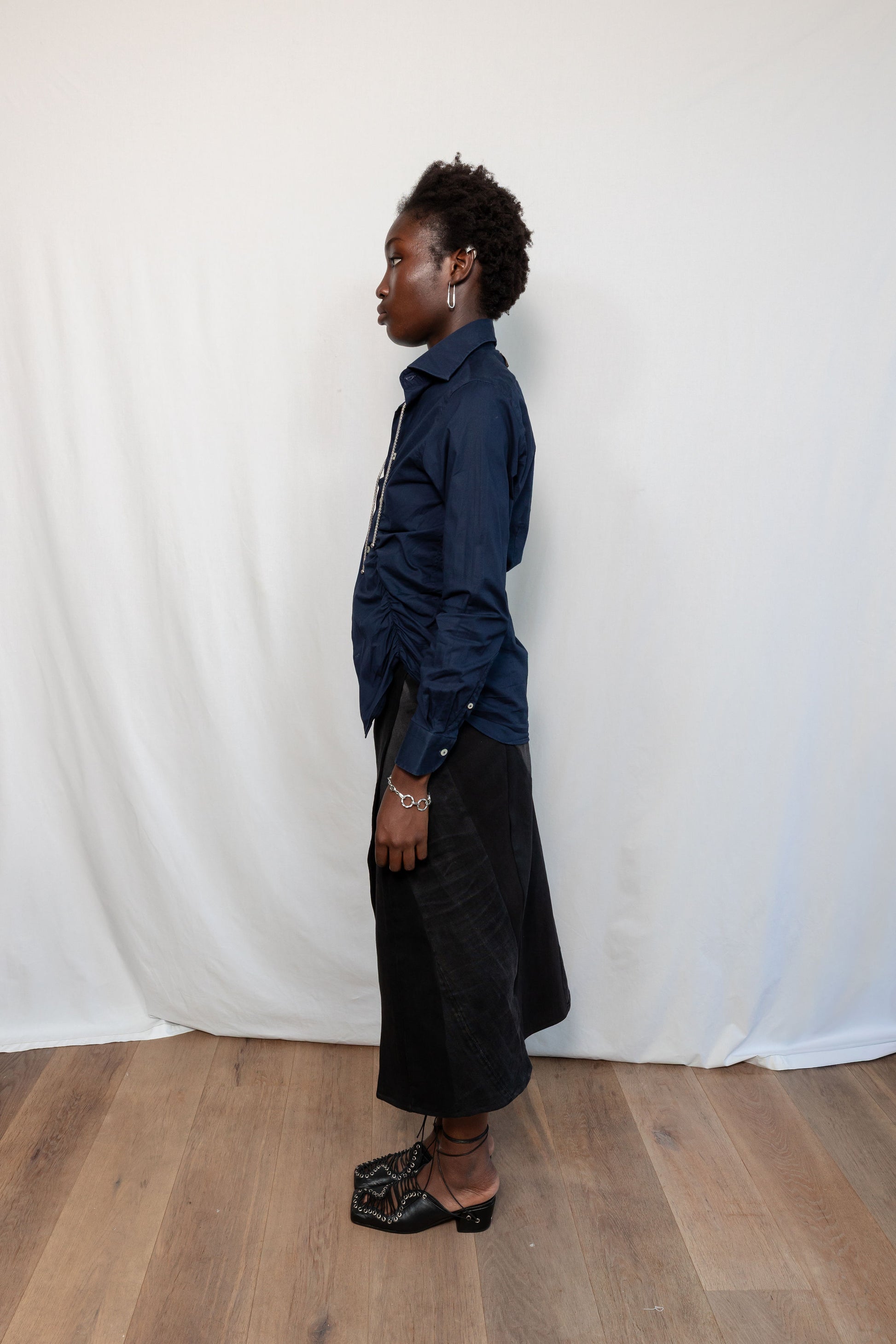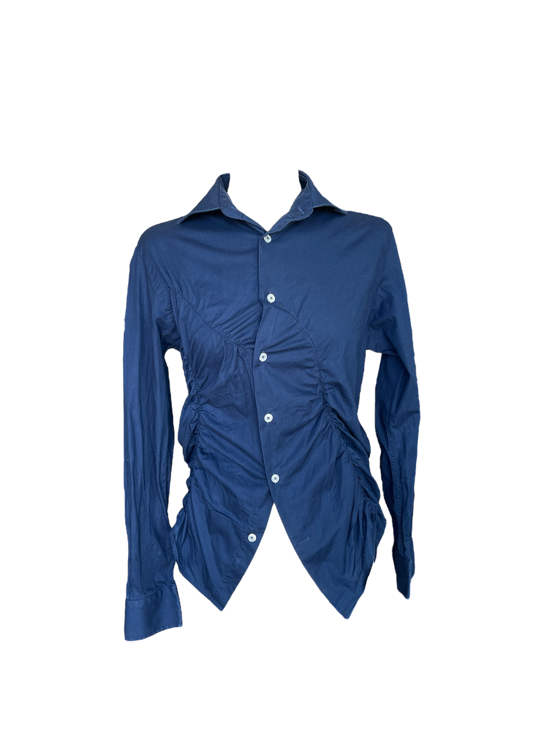 Our bestselling wave shirt in a dark blue. With two lines of asymmetric shirring that cinch in at the perfect points to flatter. Pair with a denim skirt for a casual look or spice it up with a pair of leather trousers (vintage of course!). Can be worn oversized or a bit more fitted.