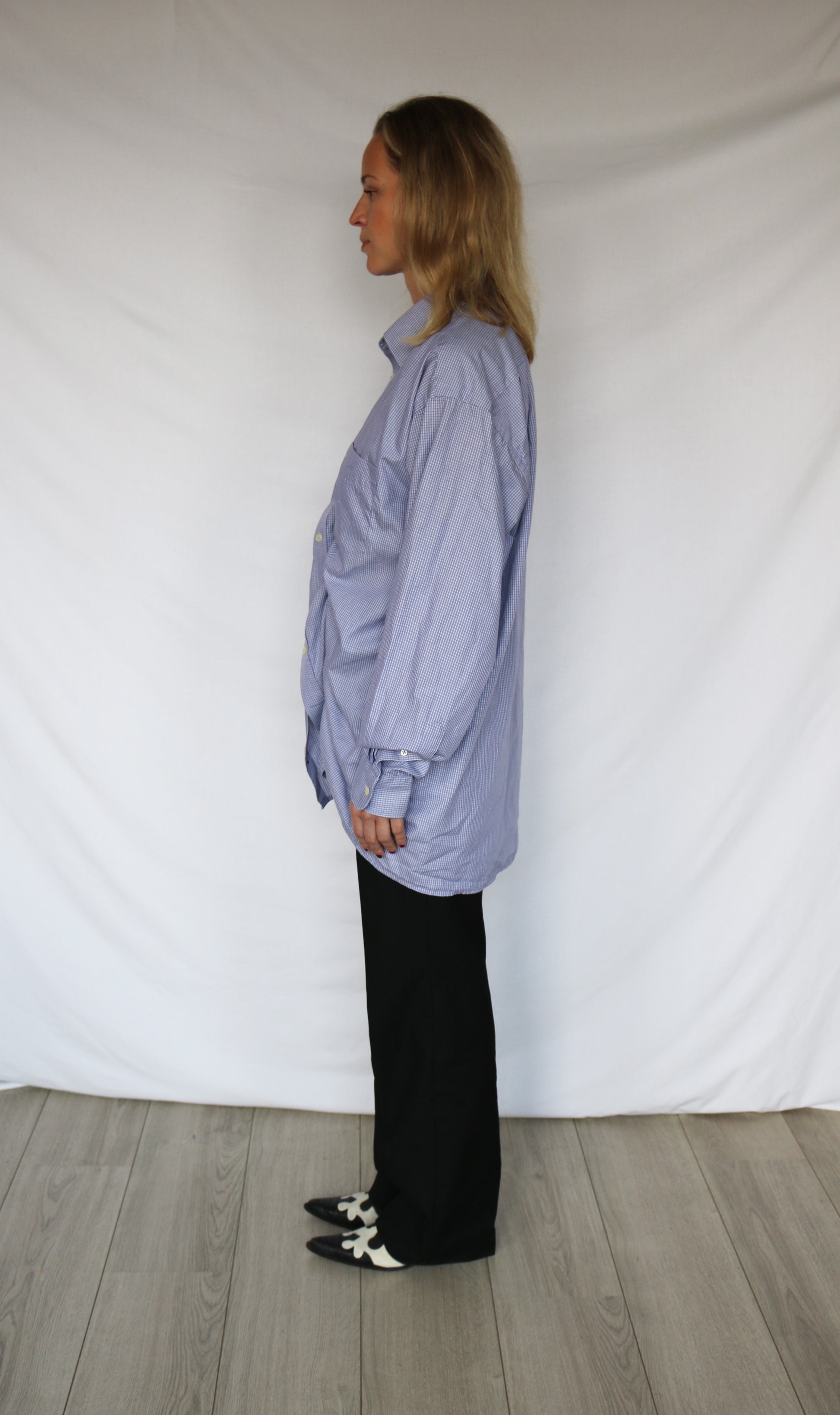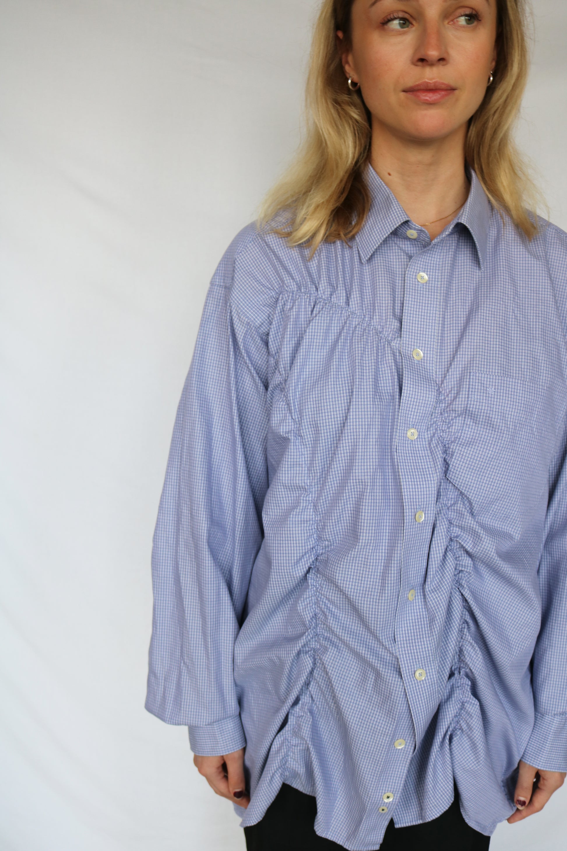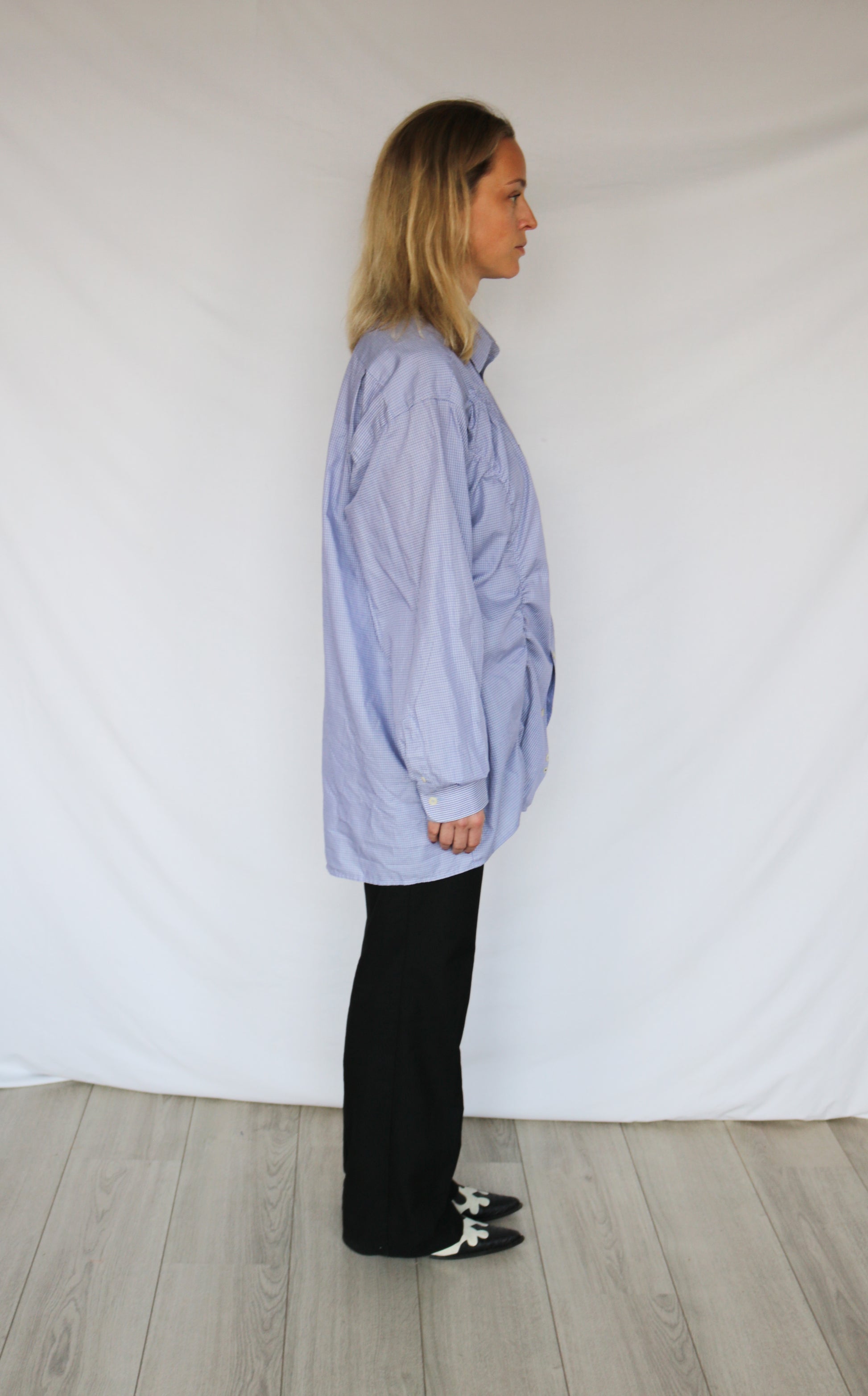 Our bestselling wave shirt. With two lines of asymmetric shirring that cinch in at the perfect points to flatter. Pair with a denim skirt for a casual look or spice it up with a pair of leather trousers (vintage of course!). Can be worn oversized or a bit more fitted.